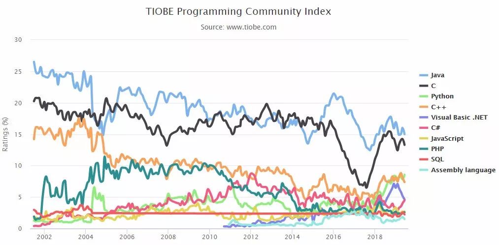 Top 10 编程语言 TIOBE 指数走势(2002-2018)