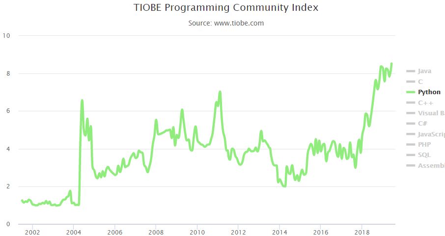 本月Python的TIOBE指数再次创下8.5%的历史新高。如果Python能够保持这样的速度,那它完全有可能在3到4年内取代C和Java,从而成为世界上最流行的编程语言。