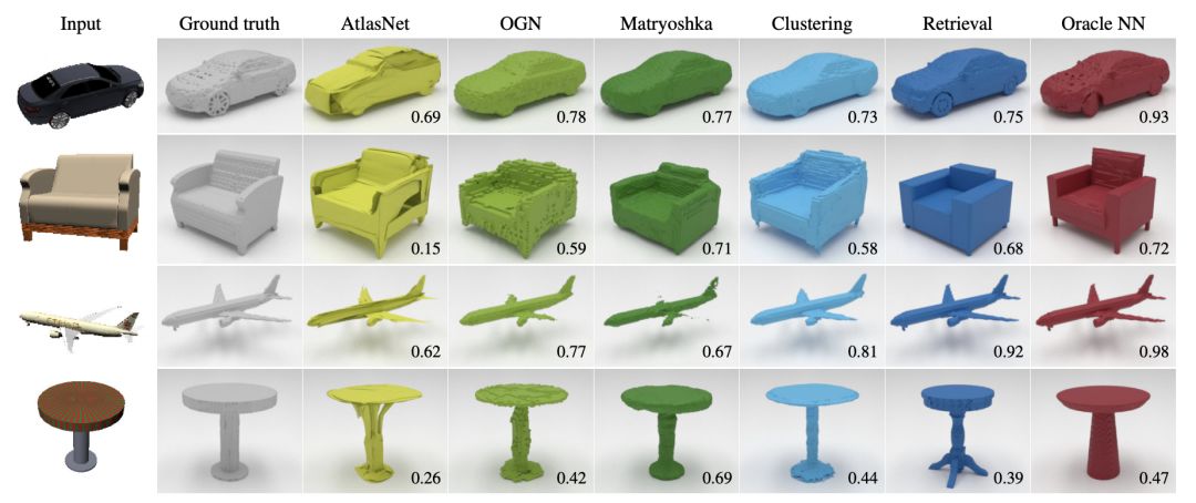 聚类基线产生的形状质量与最先进的方法相当。 检索基线通过设计返回高保真形状,但细节可能不正确。 每个样本右下角的数字表示IoU。
