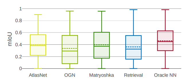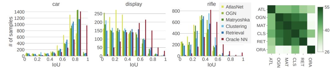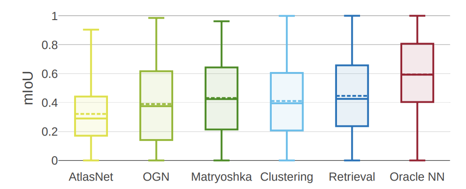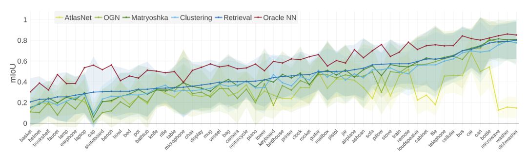 有趣的是,检索基线是一种纯粹的识别方法,在均值和中位数IoU方面都优于所有其他方法。简单的聚类基线具有竞争力,性能优于AtlasNet和OGN。