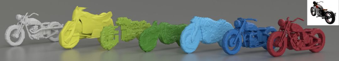 如上图所示,推断一辆摩托车的3D结构需要一个复杂的过程,它结合了低层次的图像线索、有关部件结构排列的知识和高层次的语义信息。