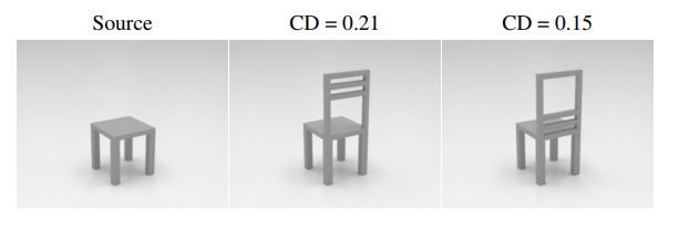 如上图所示,两者目标椅子与下方的椅子的下半部分完美匹配,但上半部分完全不同。但是根据得分,第二个目标要好于第一个。由此来看,倒角距离这个量度会被空间几何布局显著干扰。为了可靠地反映真正的模型重建性能,好的量度应该具备对几何结构变化的高鲁棒性。