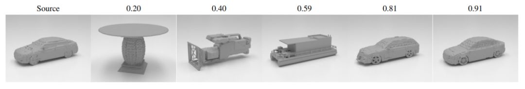 如上图所示,将一个汽车模型与数据集中的不同形状的对象进行了比较,只有 IoU分数比较高(最右两张图)时才有意义,即使IoU=0.59,两个目标可能都是完全不同的物体,比较相似度失去了意义。