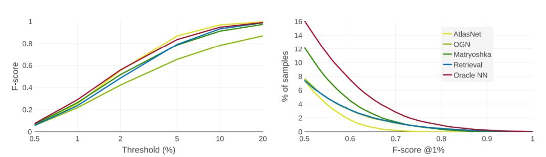 我们绘制了以观察者为中心的重建方式的F分数的不同距离阈值d(左)。在 d =重建体积边长的2%的条件下,F分数绝对值与当前范围的 mIoU分数相同,这并不能有效反映模型的预测质量。