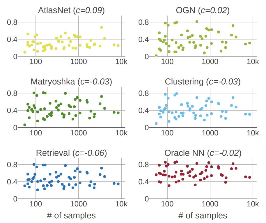 但研究人员进一步观察到,一个完美的检索方法(Oracle NN)的性能明显优于所有其他方法。值得注意的是,所有方法的结果差异都非常大(在35%到50%之间)。