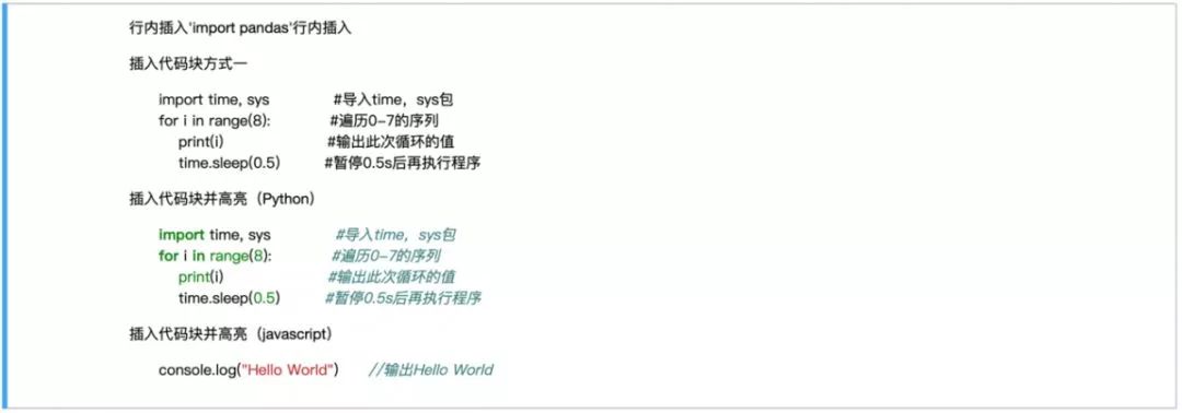 代码的插入分行内插入和代码块插入两种。当需要行内插入时,直接将代码用单引号括起来即可;当插入代码块时,有两种方式可供选择。