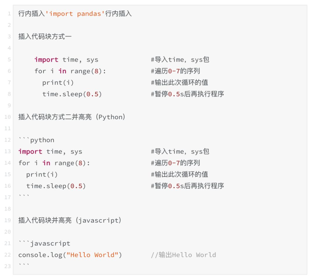 一是在代码块第一行开头输入四个【空格】或是一个【制表符】;二是使用三个反引号【```】在代码块前后将其框起来。另外,当需要代码高亮时,可以在代码块之前的【```】后面加入代码语言。需要注意的是,插入代码块之前需要至少一个空行。借用例1.2-3-3中的代码块来进行如下示例: