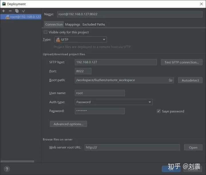 输入如下图配置,注意这里的端口是你刚刚设置的映射到容器22端口的宿主机中的端口,我这里使用的是8022,账号密码是你刚刚自己设置的,这里的Root Path设置一个远程docker容器里的路径: