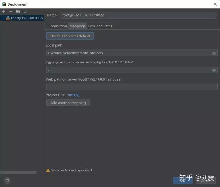 最后在Mappings中配置路径,这里的路径是你本地存放代码的路径,与刚刚配置的Root Path相互映射(意思是Mapping里本机的路径映射到远程的Root Path),方便以后在本地和远程docker中进行代码和其他文件同步。