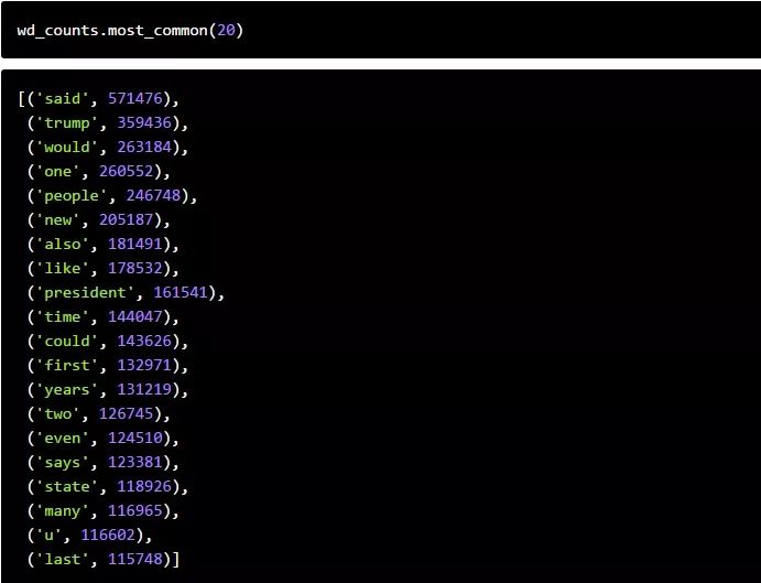 我们将使用一个Python Counter,这是一种特殊的字典,它假定每个键的值为整数类型。在这里,我们将使用文章的标记化版本来遍历所有文章。