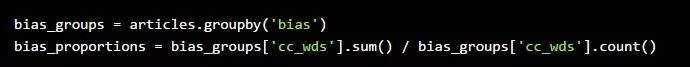 如果我们看一下出版物的左倾和右倾的政治倾向,我们将左倾的出版物称为“左”,右倾的出版物称为“右”,我们的零假设是,“左”的气候变化文章数量比例等于“右”的气候变化文章数量比例。我们的备择假设是这两个总体的比例是不相等的。我们可以用其他群体分组和相似的假设来代替其他政治倾向比较或其他出版特征。