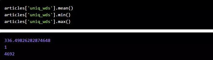 我们来看看每篇文章的平均(平均值)字数,以及我们数据集中最长和最短的文章。