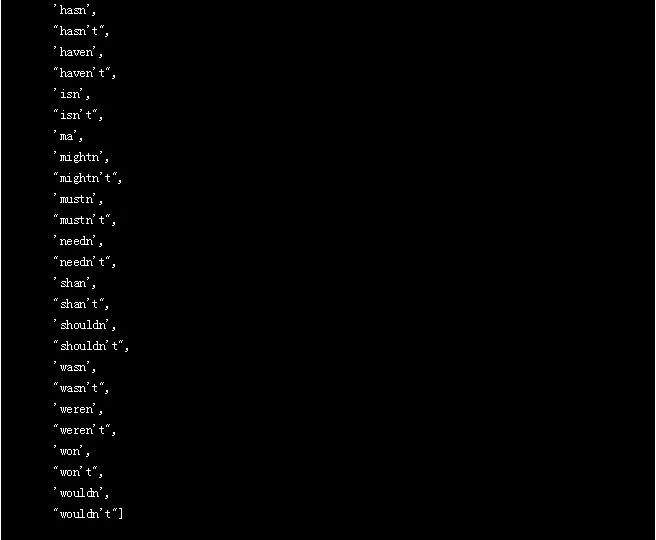 记得我们在这个项目开始的地方从nltk.corpus导入了stopwords模块,所以现在我们来看看什么单词包含在这个预先制作的stopwords列表中: