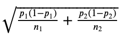 为了计算该置信区间,我们需要一个点估计和一个误差范围; 后者由临界值乘以标准误差组成。对于比例差异,我们对它的点估计值是p 1- p2,其中p1和p2是我们的两个样本比例。在95% 的CI下,临界值是1.96。接下来,我们的标准误差是: