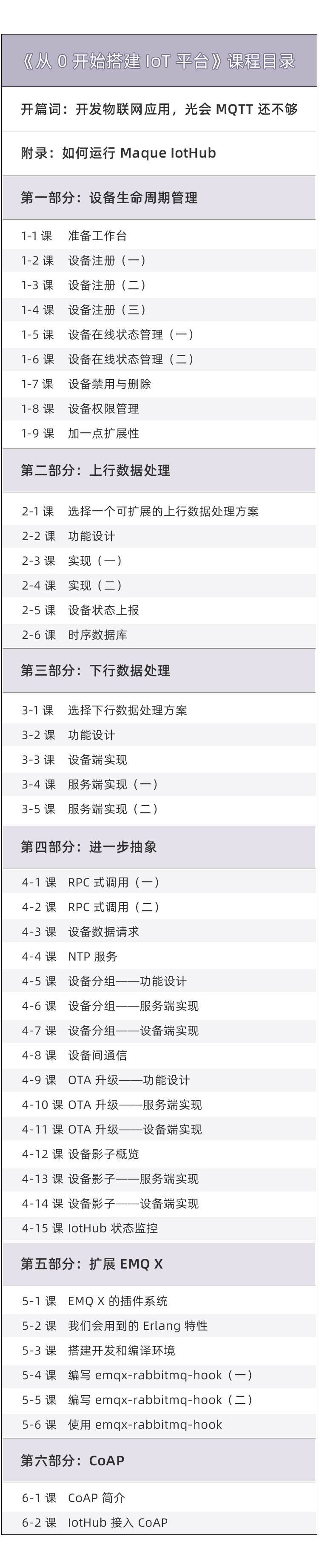 因此,我希望为大家制作一门《从 0 开始搭建 IoT 平台》的课程,把我积累的一些物联网平台在架构和设计模式等方面的经验分享给大家,学完之后,应该可以覆盖大家在物联网开发中 80% 的场景和可能遇到的设计和架构问题。