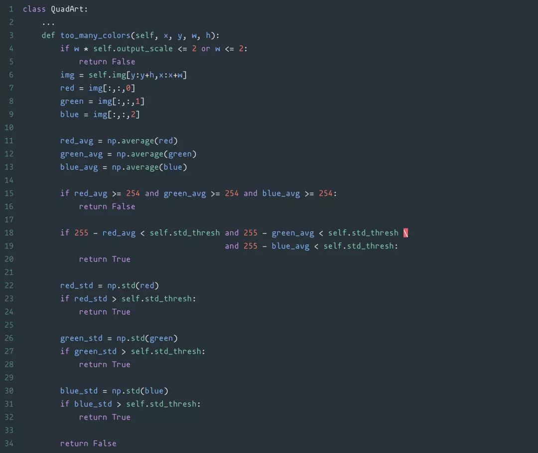 对于是否拆分为更多四分分支的 recursive_draw() 阈值,函数too_many_colors() 计算红色、绿色和蓝色的标准差,如果标准差超过阈值,则返回True。对于 Quadart 的生成,我发现一个不错的阈值大约是 25 标准差,否则图像会变得太像素化或太细。python图像分析库imageio非常适合这种分析,因为它可以直接插入numpy进行快速统计计算。