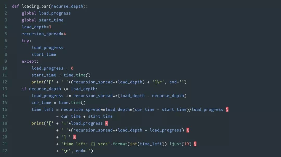 为了监视你自己的递归函数,你可以很容易地将它放在python代码的顶部,将recursion_spread 修改为函数每次递归时调用自身的次数,然后从递归函数的所有端点调用loading_bar() ,确保在每个递归分支它只被调用一次。