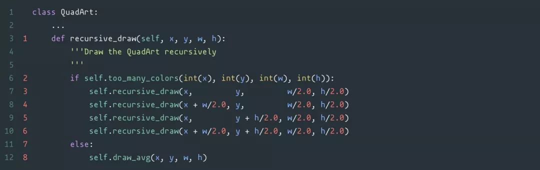 上面的算法是直接从我的代码中提取出来的。class QuadArt 是包含 imageio 图像数据、 wand 绘制画布和标准差阈值的类。x, y, w, h被传递到函数中,以指定当前被分析子图像左上角的x,y位置,以及它的宽度和高度。