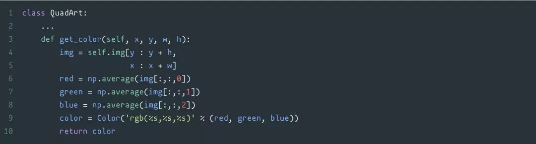 函数 get_color() 首先获取输入图像的裁剪部分(以imageio格式),然后计算该裁剪部分中红色、绿色和蓝色的平均值,然后根据计算出的平均颜色创建wand.color.Color 对象。