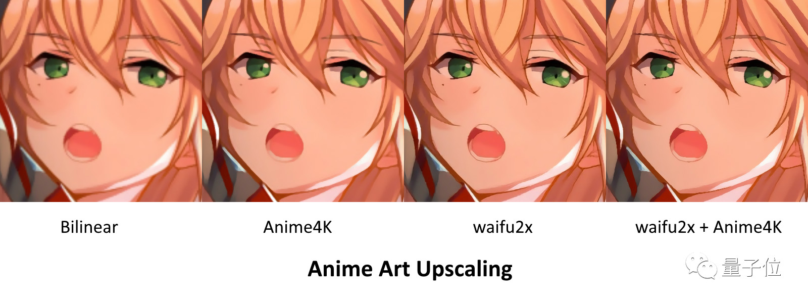 这场比赛,Anime4K (最右) 的对手有:来自madVR的不开源算法NGU前辈 (左二) ,以及开源的机器学习算法waifu2x前辈 (左三) 。