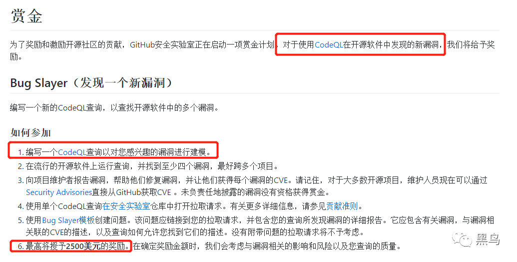 但从描述来看,Github还是希望安全研究员使用CodeQL进行挖掘新漏洞,并可以提交赏金。最高获得2500美元。