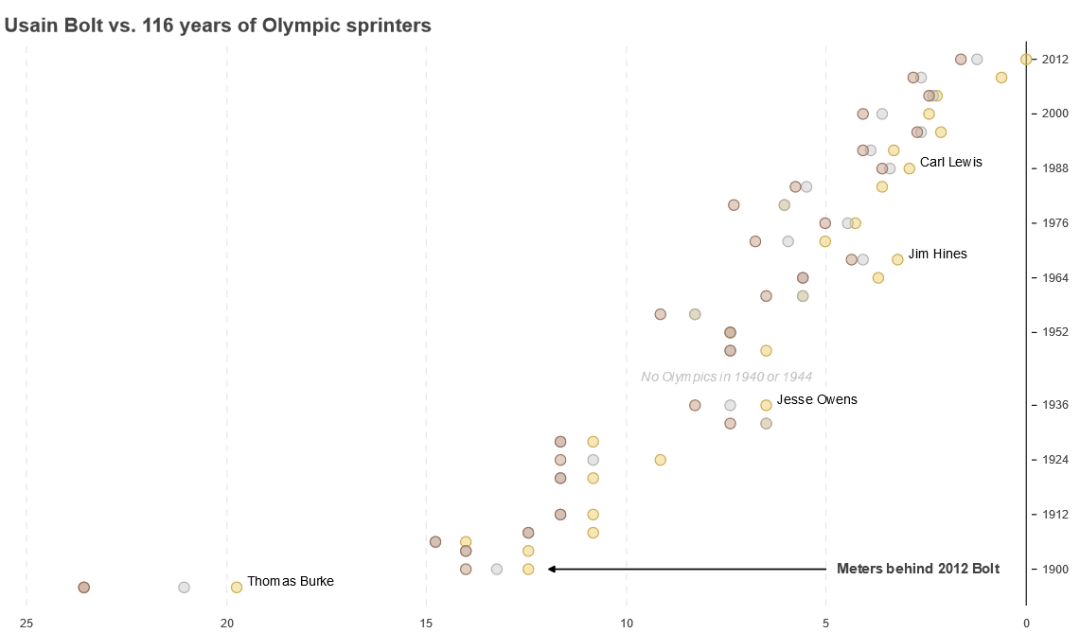 plot.title.text = "Usain Bolt vs. 116 years of Olympic sprinters"