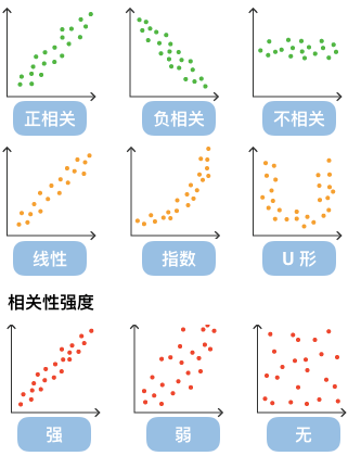 通过观察散点图数据点的分布情况,我们可以推断出变量间的相关性。如果变量之间不存在相互关系,那么在散点图上就会表现为随机分布的离散的点,如果存在某种相关性,那么大部分的数据点就会相对密集并以某种趋势呈现。