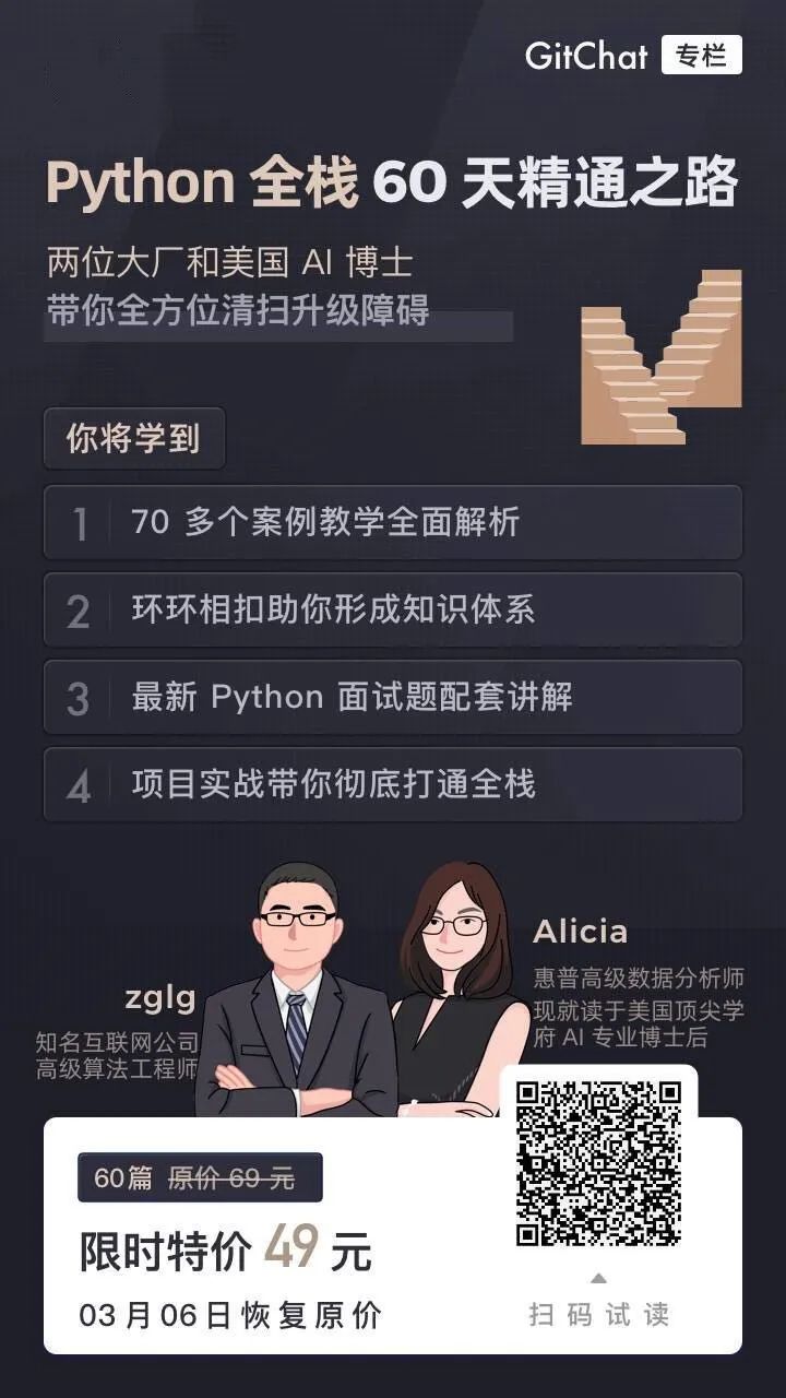 所以我提炼出过往五年多的工作经验,并和远在美国学府进修的 AI 博士后老师一起撰写了这个《Python 全栈 60 天精通之路》专栏。