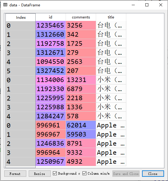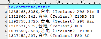 现在要将这三张台电、苹果、小米商品信息表合并成一张数据表以便进行分析,先将三张表数据导入到数据框中,输入代码如下: