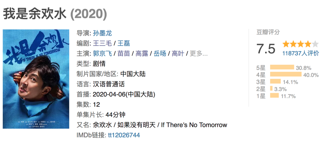 目前在豆瓣上,《我是余欢水》为7.5分。共有11万的人给出了评分,其中百分之30.8%给出了5星,40%的给出了4星,是非常不错的成绩。