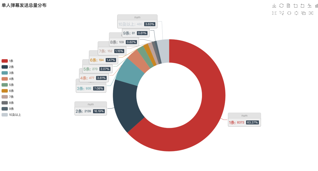 根据数据,在发送弹幕的人群中,63.7%的人发了一条弹幕,16.9%发了两条,少数比较话痨的人发了10条以上的弹幕,占比3.63%。