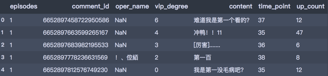主要包含了以下信息:集数、评论ID、用户名、vip等级、评论内容、评论时间点和评论点赞。