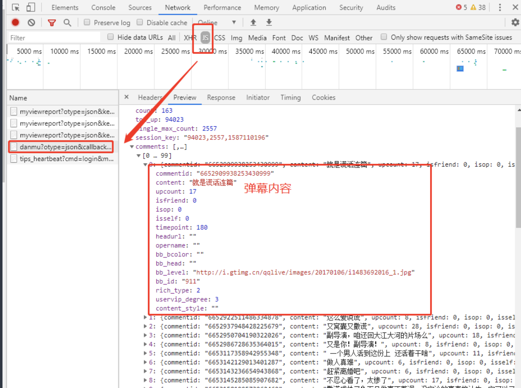 我们使用谷歌浏览器,右键审查元素,观察Network的请求,播放开始后出现了大量请求,我们在js选项下发现了一个比较特殊的请求 "danmu" ,打开这个请求后发现这就是我们要的弹幕数据。