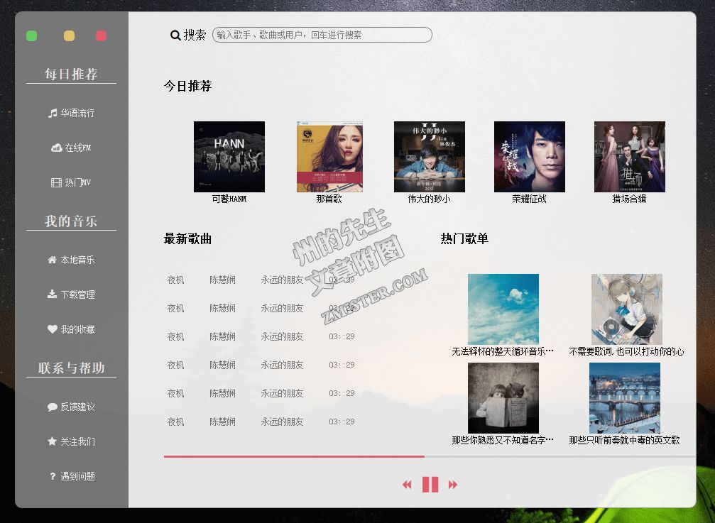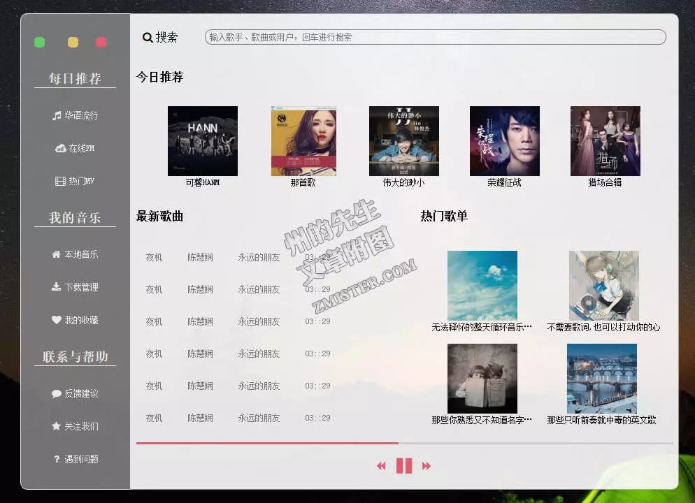 因为图形界面是会呈现出无边框的圆角形式,所以右侧的部件的右上角和右下角需要先行处理为圆角的,同时背景设置为白色。对推荐模块、音乐列表模块和音乐歌单模块的标题我们也需要对其字体进行放大处理,所以最后的样式为: