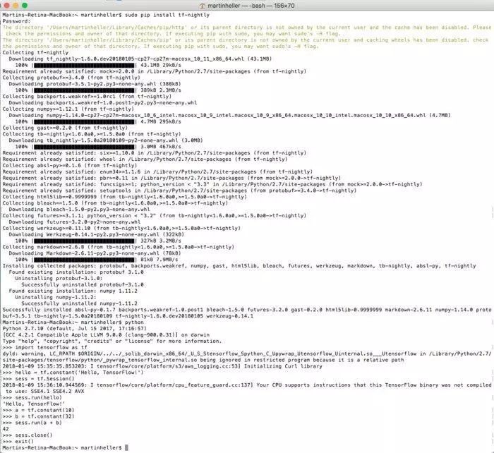 尽管目前的 master 分支文档声称,三个平台的 CPU 和 GPU 版本都有隔夜版本,但我无法为 Mac 安装 GPU 版本,因为 Pip 找不到它。根据我以往的经验,Mac GPU 版本虽然能安装成功,但并不能使用,直到 r1.2 发布,Mac GPU 版本被删除。我不确定在 r1.6 版本中恢复 Mac GPU 的计划是否属实,或者隔夜构建文档是否有误。无论如何,在不改写当前安装的情况下快速安装 GPU 总比之前有了进步。
