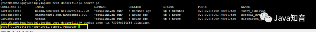 疑问1:怎么进入容器后直接在webapps目录下,这就是因为我们这个镜像是用Dockerfile制作的,Dockerfile上面我们自己WORKDIR到webapps目录下的呀。