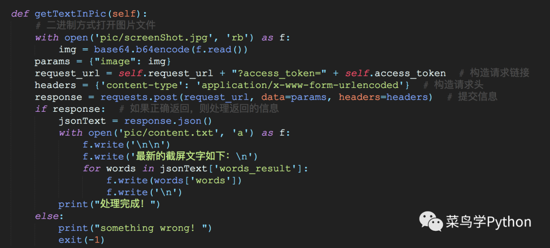 上述的程序中,我们直接采用百度文字识别的API接口即可(如何使用百度AI接口这个前面的历史文章提到多次)。