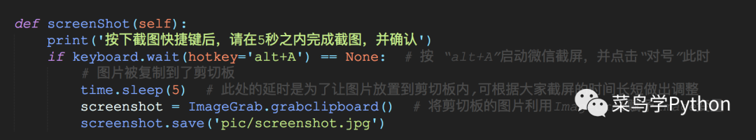 接着程序必须等待5秒,让微信完成截屏并将图片放入到剪贴板中去,当完成这一步之后,程序才能继续向下执行;