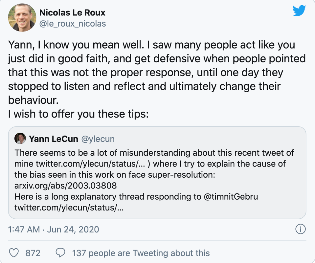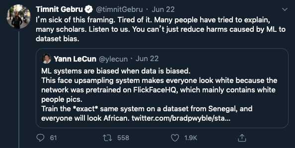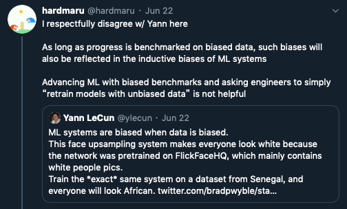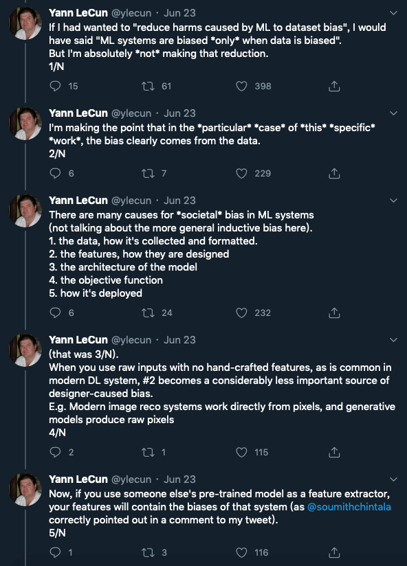 Yann LeCun 的说法本身没有错,但可能是因为过于直白了,一下子让大量 AI 从业者和研究人员炸了锅。LeCun 希望将人们的注意力引向数据集的偏差,但推特网友不买帐,并指责他「用这种陈旧的理由来掩盖问题本质」。之后,Yann LeCun 又在多条推文来解释自己关于偏见的立场,但仿佛已经没有用了。