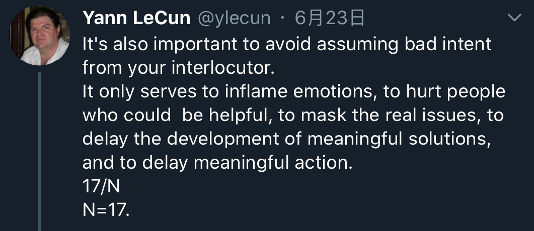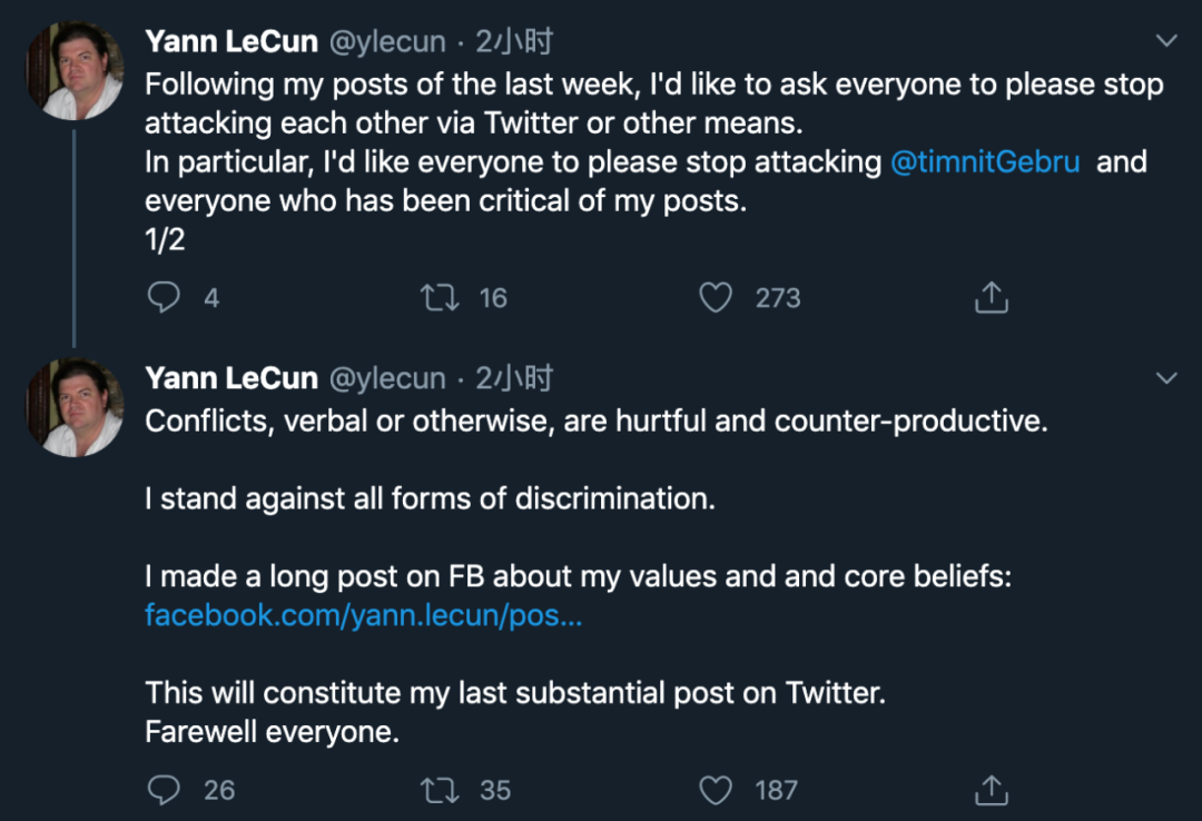 「我请求社交网络上的所有人不要再互相攻击了,特别是对于 Timnit Gebru 的攻击,以及对于我之前一些言论的攻击。」Yann LeCun 刚刚在推特上发出了这样的呼吁。「无论是口头还是其他方式的冲突,都只能获得伤害和相反的结果。我反对一切形式的歧视。这里有一篇关于我核心价值观的文章。」「这是我在推特上最后一篇有内容的帖子,大家再见。」