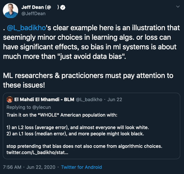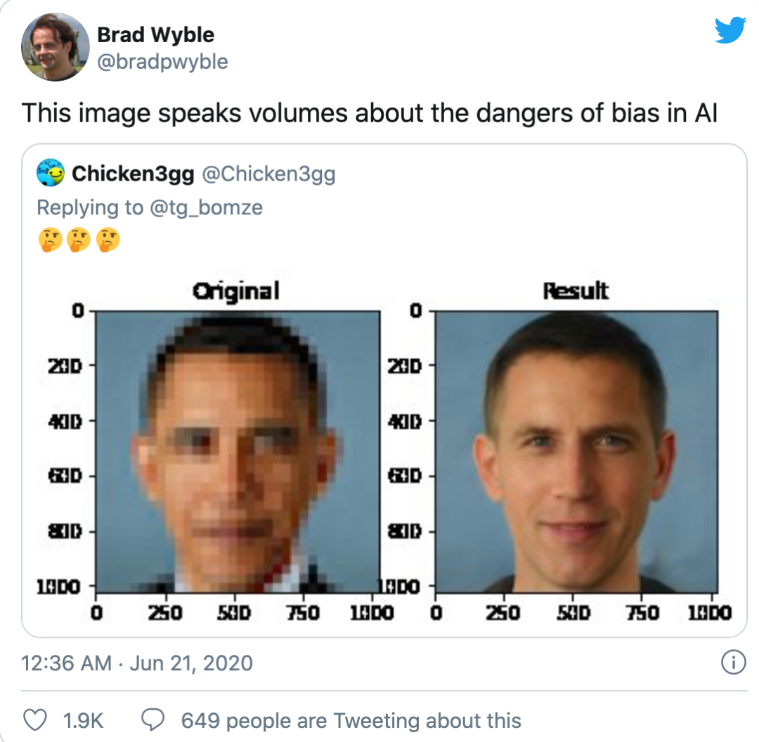 有网友质疑该方法生成结果存在偏见,对此项目作者也给出了回应,表示这一偏见很可能来自于 StyleGAN 的训练数据集,可能还有其他未知因素。「我们意识到偏见是机器学习和计算机视觉领域的重要问题,并就此问题联系了 StyleGAN 和 FFHQ 数据集的创建者。我们希望这能够促进不具备此类偏见行为的方法的诞生。」但这件事还没完,鉴于美国目前 BLM 的舆论环境,人们很快就开始深入讨论机器学习研究结果缺乏多样性的问题。在这其中,种族偏见和性别偏见的问题一直存在,迄今为止却没人给出一个好的解决办法。 也就在这个时候,Yann LeCun 发布了一条推特,来解释为什么 PULSE 会出现这样的偏见。