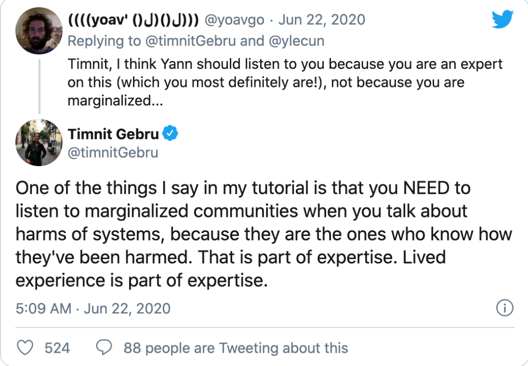 斯坦福 AI Lab 成员、Google AI 科学家 Timnit Gebru(她是一名非洲裔美国人),对 LeCun 的言论表示「失望」。Yann LeCun 甚至在 Timnit Gebru 的推特评论区连写 17 条回复: