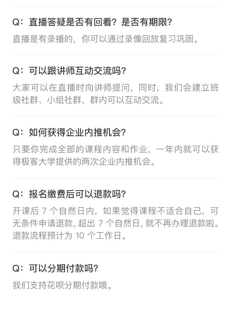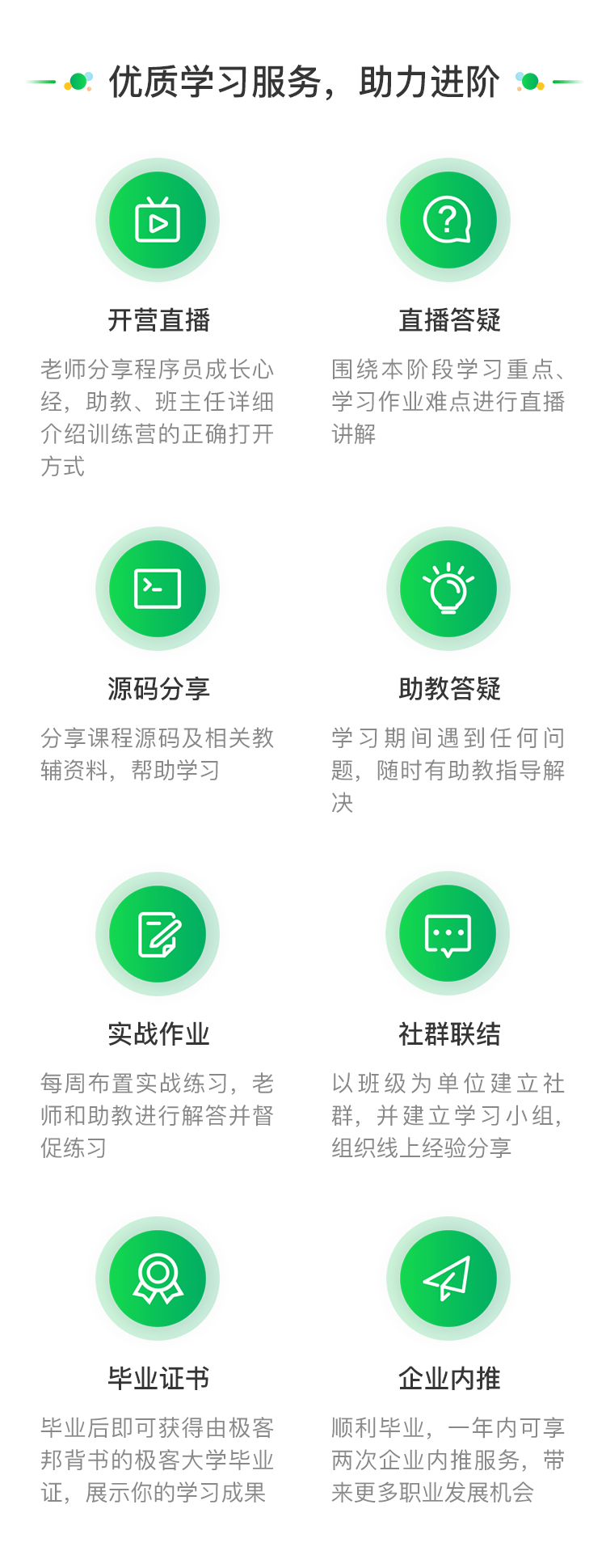 2. 8 周视频教学 + 线上直播答疑 + 70 天刻意练习 + 助教每日答疑