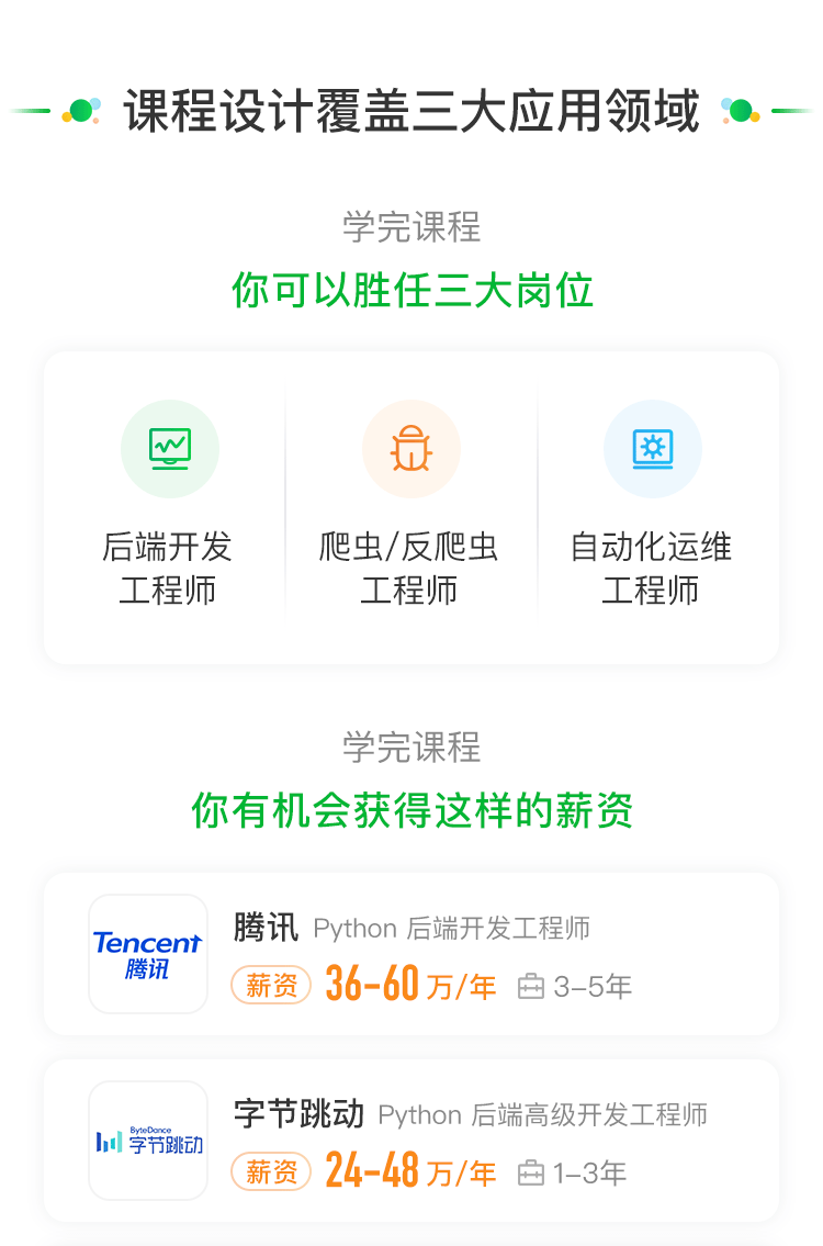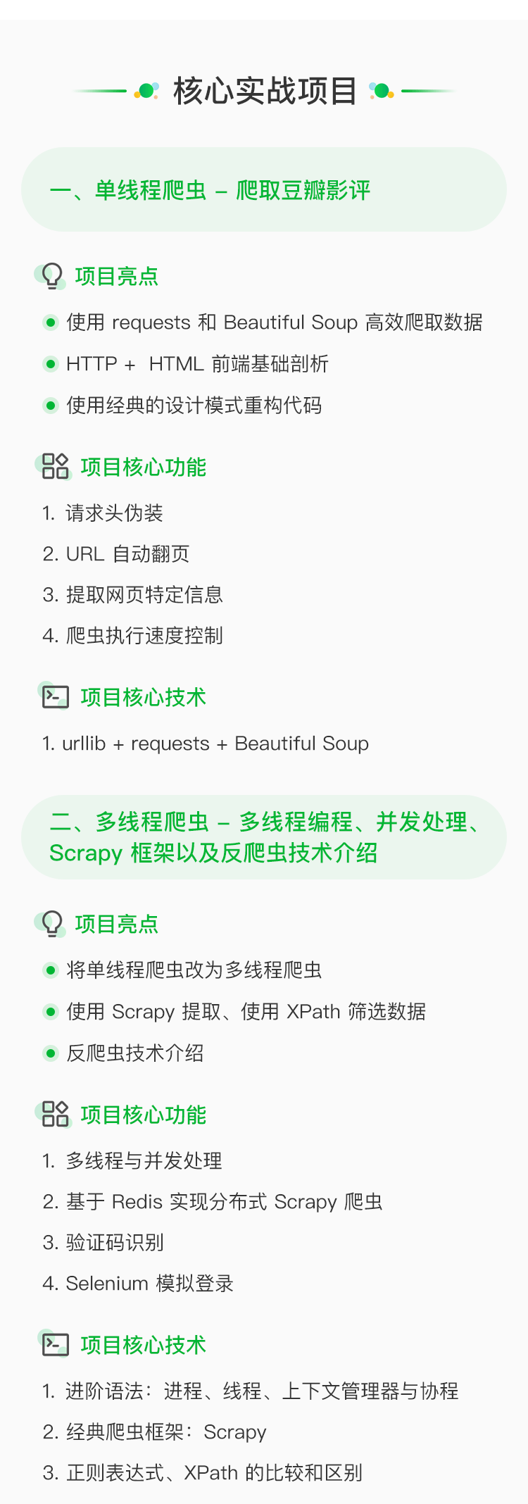 课程内容从一个简单的单线程爬虫案例开始,逐步扩展为多线程爬虫,紧接着对收集到的数据进行存储、清洗、分词以及情感分析,最后再通过 Web 清晰地展示给用户。学完之后,你可以胜任三大岗位:后端开发工程师、爬虫/反爬虫工程师、自动化运维工程师;掌握爬虫工程师必备技能、自动化运维工程师进阶技巧、Python 后端实战案例、数据处理与分析相关技巧。