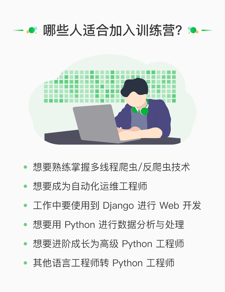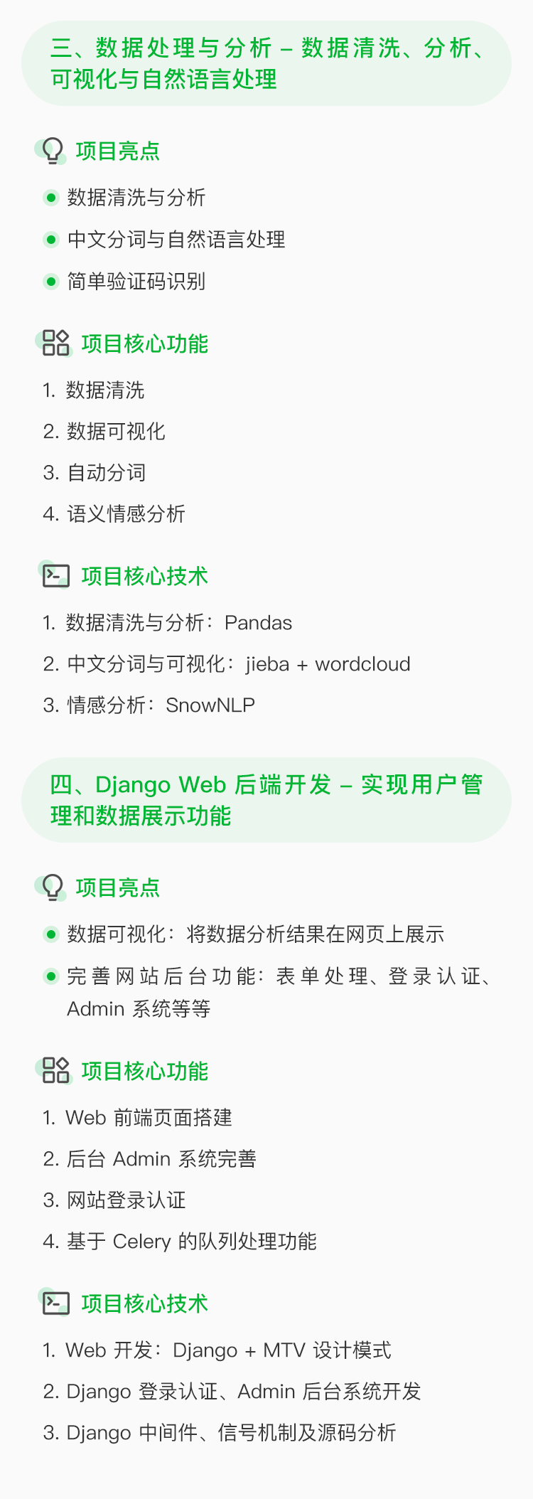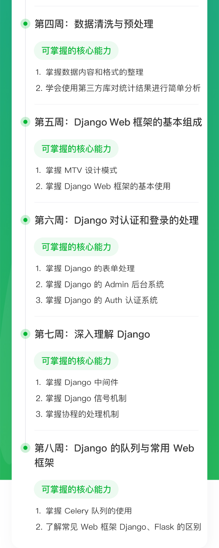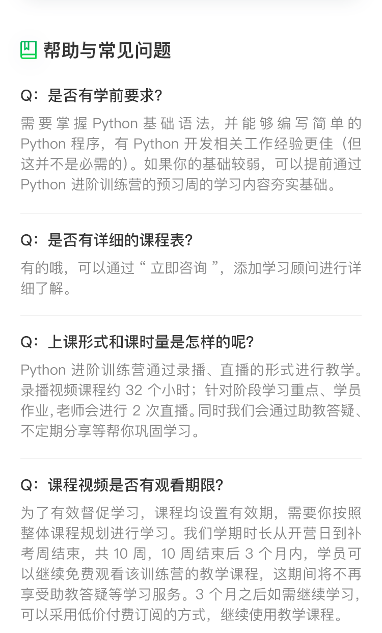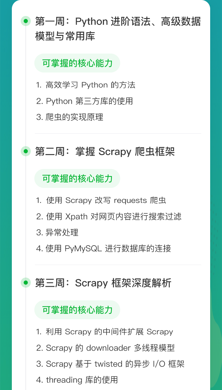 训练营涉及到的知识点包括:Python 基础语法及进阶语法、常用第三方库、多线程、并发、协程锁、高阶函数、装饰器、设计模式、Python 内置数据类型的方法实现原理等 Python 高阶知识点。同时还包括了 Scrapy 爬虫开发、正则表达式、Xpath、Django Web 开发、Pandas 数据清洗、jieba 分词、snowNLP语义情感标注、Celery队列等进阶知识。这期间,我会进行直播解答你在实战练习中的疑难点,也会有大厂助教跟我一起,随时对你的问题和进展进行反馈。