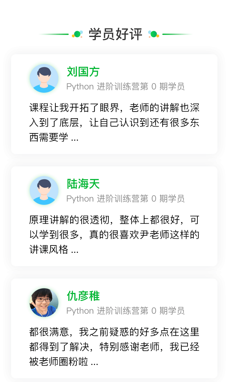 因此,我与极客时间合作的「Python 进阶训练营」全新改版上线,将带你通过 70 天实战演练,手把手带你进阶 Python 高手。