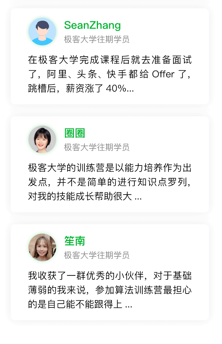 优秀毕业生毕业一年内,随时可获得极客大学提供的两次企业内推服务,更有 TGO 鲲鹏会的 600 家企业推荐通道为你敞开,获得更多的职业发展机会。