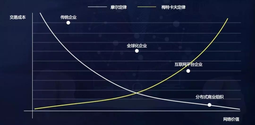 互联网模式被挑战的原因也是同样的,基于区块链的分布式商业有机会构建一个比传统互联网企业更大的协作网络,以及以更低成本运行的形态。