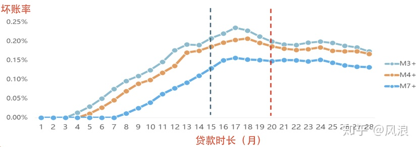 一般通过账龄分析或者Vintage分析目标用户的“违约成熟度长度”来定义表现期。具体方法是将不同时期申贷的用户按“贷款时长”进行对齐,即观察用户还款多少期后,其违约率开始稳定,不会出现较大的变化/转移。由下图可以看出,可以将表现期定义为15期/20期。