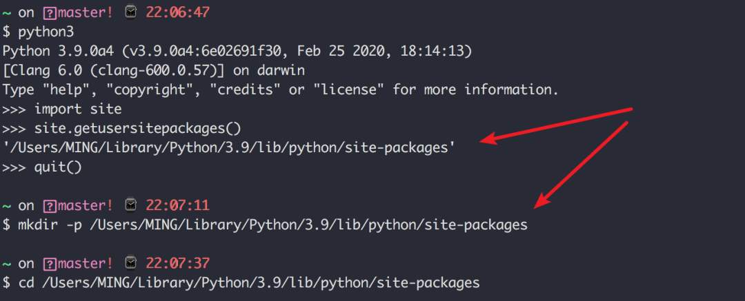 我们需要新建一个用户环境目录,这个目录比较长,不需要你死记硬背,使用 site 模块的方法就可以获取,然后使用 mkdir -p